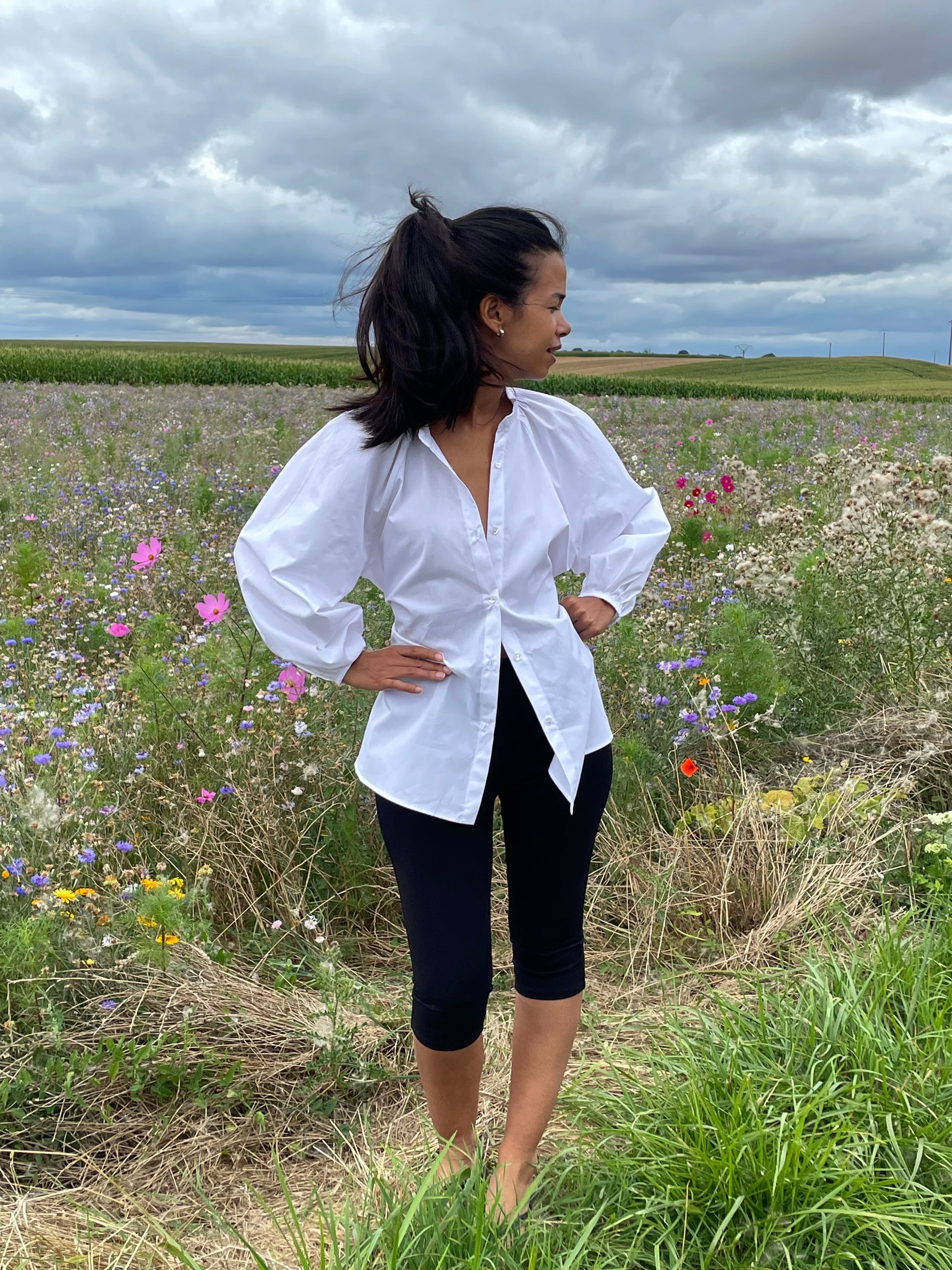 OLETA blouse is a timeless piece for an elegant and versatile wardrobe. With its gathered shoulders and ability to be tied both front and back, it offers a personalized fit.