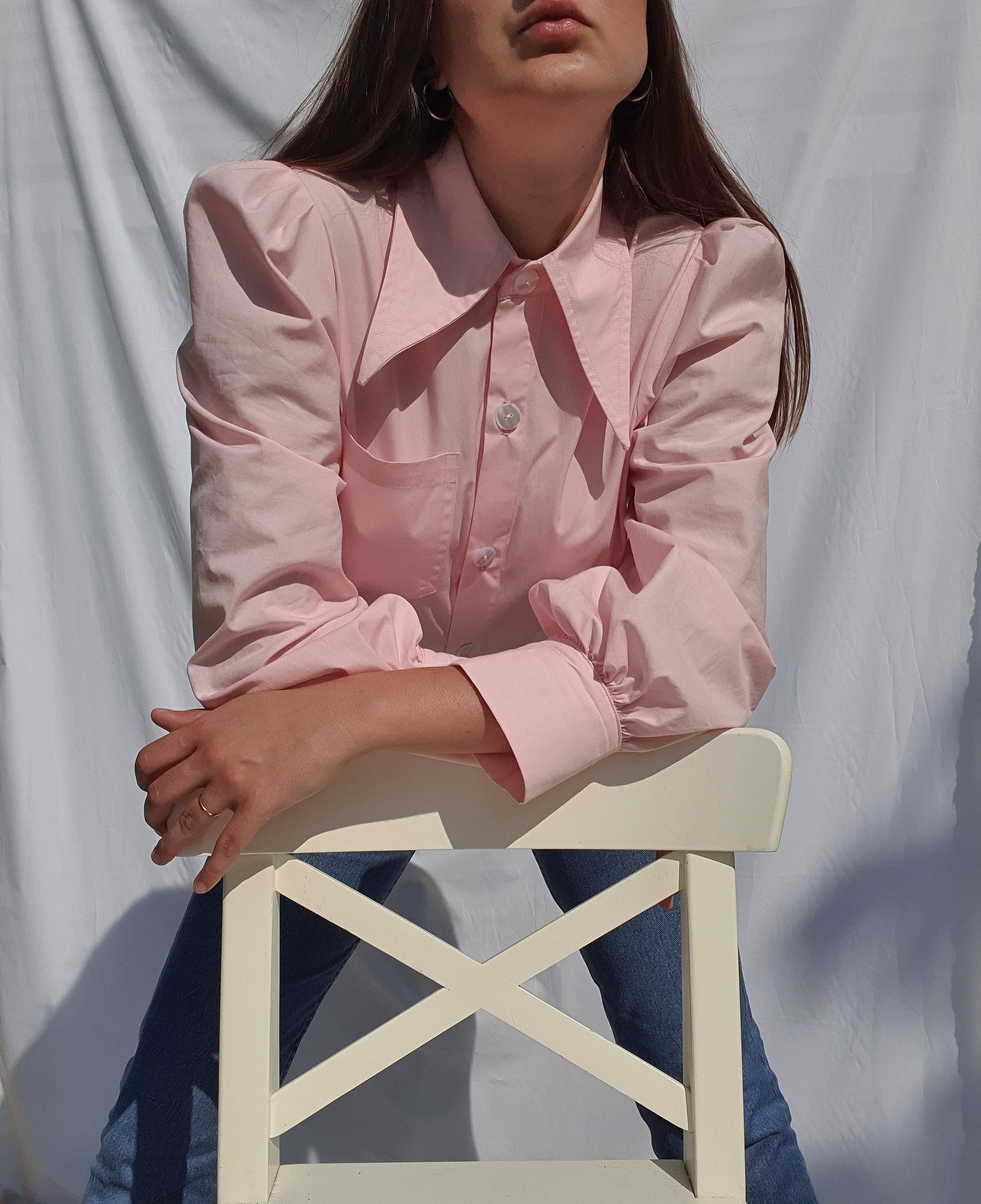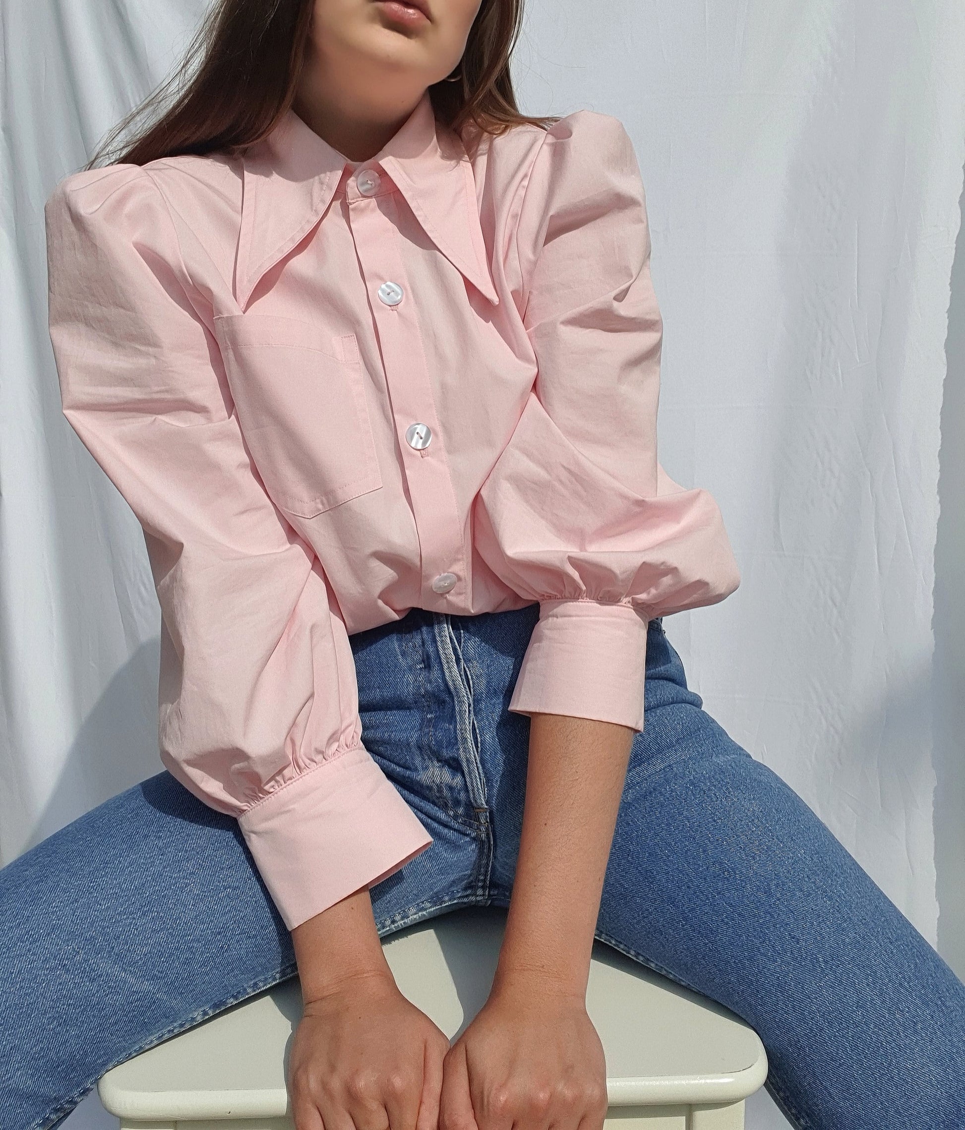 Pink JACK shirt in masculine-feminine blend. Pointed seventies collar and puffed sleeves with cuffs. Pearly buttons for a touch of elegance